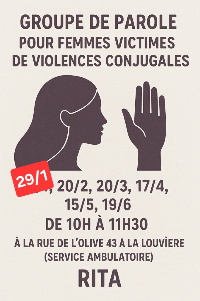 Un nouveau groupe de parole démarrera à partir du jeudi 29 janvier. Il aura lieu ensuite un vendredi par mois en matinée à La Louvière. Il est accessible à toutes les femmes et les jeunes filles qui subissent ou ont subi de la violence de la part d’un partenaire ou d’un ex. La participation est gratuite mais sur inscription préalable par téléphone au 064 21 43 33 ou par sms au 0493 18 62 49.